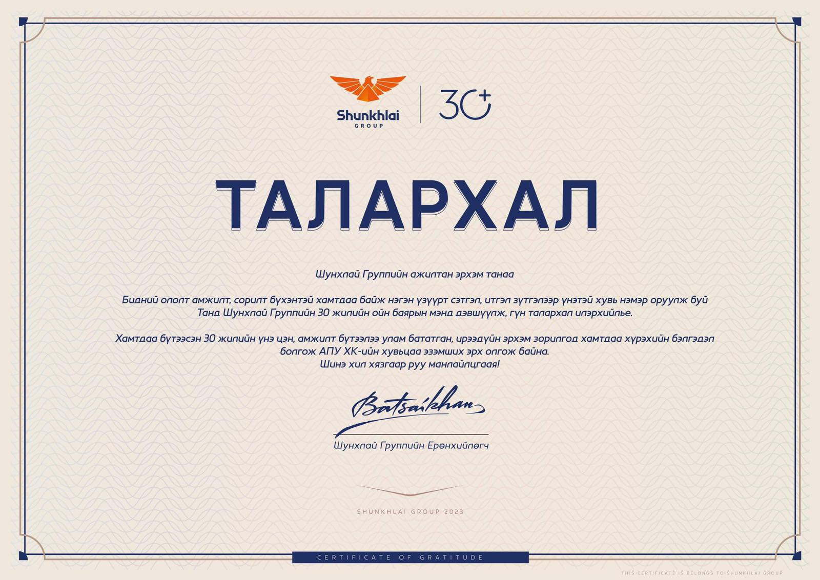 Монгол Улсын хувийн хэвшлийн анхдагчдын нэг Шунхлай Групп 30 жилийн ойгоо тохиолдуулан групп компанийн нийт 7500 ажилтандаа талархал илэрхийлж, АПУ ХК-ийн хувьцаа эзэмших эрх олгох шийдвэр гаргалаа.